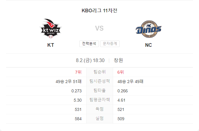 두 팀의 성적과 주요 지표를 비교했을 때, KT 위즈가 다소 우세할 가능성이 있습니다. KT 위즈는 타율과 평균 득점에서 NC 다이노스를 앞서고 있으며, 로하스의 뛰어난 타격력이 팀의 승리에 큰 기여를 할 것으로 보입니다. NC 다이노스 역시 박건우의 활약에 기대를 걸 수 있지만, 전체적인 팀 전력에서 KT 위즈에 밀릴 가능성이 큽니다. 따라서 이번 경기는 KT 위즈의 승리를 예상합니다.