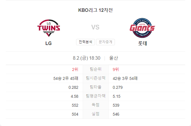8월 2일 KBO 프로야구 LG 트윈스 VS 롯데 자이언츠 타카짱의 경기 예측 분석