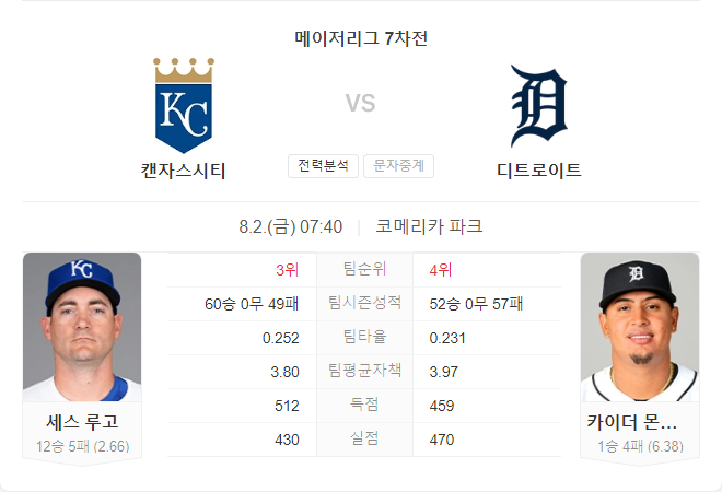 캔자스시티 로열스는 시즌 후반으로 접어들며 플레이오프 진출을 위해 승리가 절실한 상황입니다. 디트로이트 타이거즈는 시즌 후반기로 들어서면서 다시 한번 '내년을 기약하자'는 마음으로 경기에 임하고 있습니다. 로열스는 세스 루고의 안정적인 투구와 타선의 강력한 지원을 바탕으로 이번 경기를 유리하게 이끌 것으로 보입니다. 반면, 타이거즈는 젊은 투수 몬테로의 기복 있는 투구로 인해 어려움을 겪을 가능성이 큽니다. 따라서 이번 경기에서는 캔자스시티 로열스의 승리를 예상합니다.