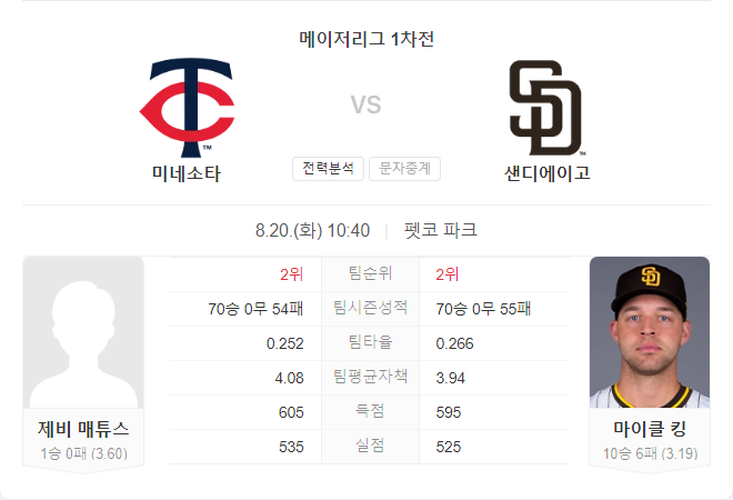 샌디에이고 파드리스는 마이클 킹의 홈 경기 강점과 불펜의 안정성을 바탕으로 이번 경기를 유리하게 이끌 가능성이 큽니다. 반면 미네소타 트윈스는 매튜스의 원정 경기 적응력과 수비 문제를 해결하지 못할 경우 어려운 경기를 펼칠 것으로 예상됩니다.