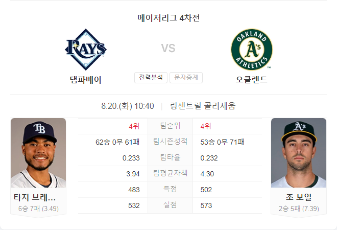 8월 20일 메이저리그 MLB 탬파베이 레이스 VS 오클랜드 어슬레틱스 타카짱 경기 예측 분석