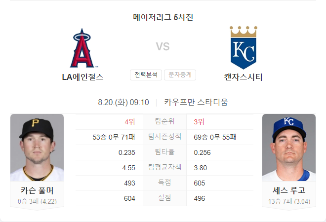 8월 20일 메이저리그 MLB LA 에인절스 VS 캔자스시티 로열스 타카짱 경기 예측 분석