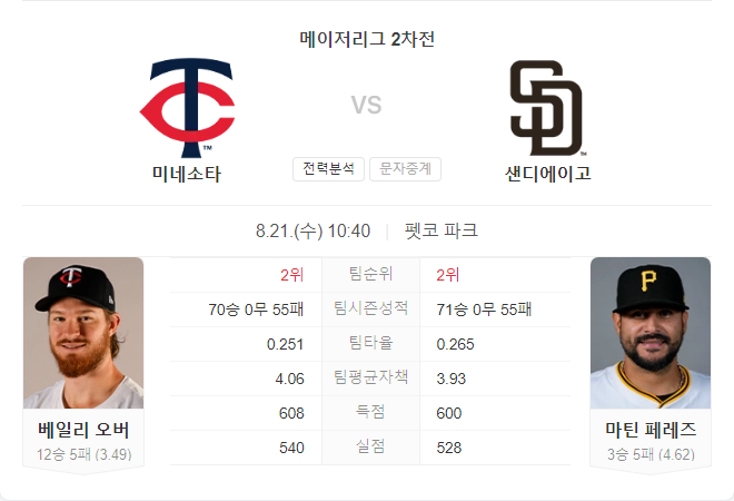 미네소타 트윈스는 선발 투수 오버가 후반기 들어 압도적인 투구를 선보이며 원정 경기에서도 강한 모습을 보이고 있다. 그러나 타선은 주로 홈런에 의존하는 경향이 있으며, 펫코 파크에서의 홈런 생산은 어려울 것으로 예상된다. 불펜은 안정적인 모습을 보여주고 있지만, 상대의 공격을 차단하는 데 샌디에고에 비해 다소 부족해 보인다. 미네소타는 오버의 강력한 투구를 바탕으로 경기를 주도하겠지만, 홈런 생산이 어려운 환경에서 득점력을 극대화해야 승리할 수 있을 것이다.