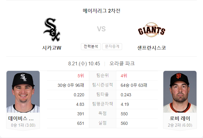 이번 경기는 선발 투수들의 성적이 중요한 변수가 될 것이다. 샌프란시스코는 레이의 제구력 회복과 홈 경기에서의 강한 타선을 바탕으로 경기를 이끌어갈 가능성이 크다. 시카고는 마틴의 야간 경기 부진을 극복하고, 타선의 홈런 생산을 늘려 득점 기회를 살려야 승리할 수 있을 것이다. 예상 스코어는 4-2 또는 3-1로, 샌프란시스코가 승리할 가능성이 크다.