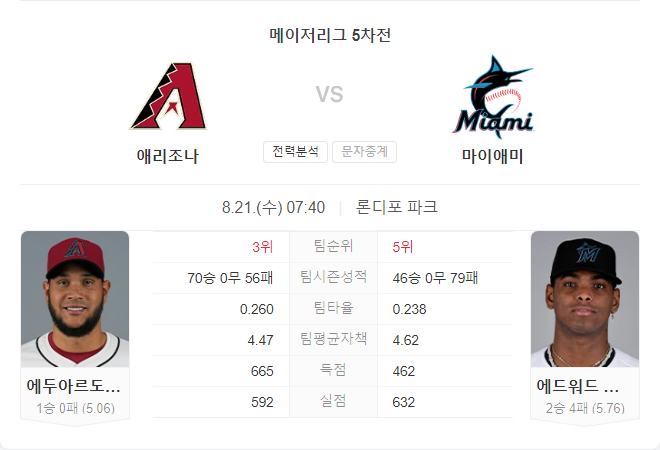 8월 21일 메이저리그 MLB 애리조나 다이아몬드백스 VS 마이애미 말린스 타카짱 경기 예측 분석