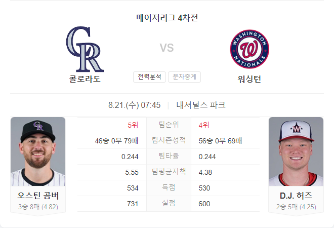 8월 21일 메이저리그 MLB 콜로라도 로키스 VS 워싱턴 내셔널스 타카짱 경기 예측 분석