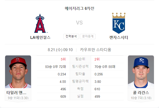 이번 경기는 두 팀의 선발 투수들이 경기 결과에 중요한 영향을 미칠 것이다. 캔자스시티는 레이간스의 호투와 타선의 강점을 바탕으로 승리를 노리며, LA 에인절스는 앤더슨의 좌완 강점을 활용해 캔자스시티 타선을 제압해야 한다. 예상 스코어는 6-4 또는 5-3으로, 캔자스시티가 승리할 가능성이 크다.