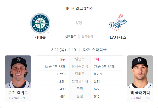 8월 22일 메이저리그 MLB 시애틀 매리너스 VS LA 다저스 타카짱 경기 예측 분석