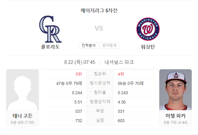 워싱턴 내셔널스는 선발 투수 미첼 파커의 홈 경기에서의 안정적인 투구가 기대되며, 콜로라도의 태너 고든은 최근 부진을 극복하기 어려울 것으로 보입니다. 전날 경기에서 콜로라도의 타선이 미비한 점을 고려할 때, 선발에서 우위를 점한 워싱턴이 승리에 더 가까운 상황입니다.