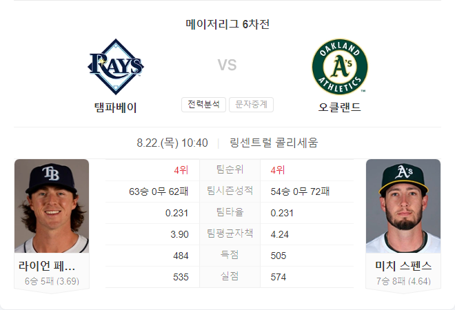 양 팀 모두 타격에서 어려움을 겪고 있는 상황에서, 이번 경기는 투수전 양상이 될 가능성이 큽니다. 특히, 오클랜드 어슬레틱스는 홈에서의 강점을 살려 승리를 가져갈 가능성이 높습니다. 탬파베이 레이스는 원정 경기에서의 불안정한 투구와 타선의 부진이 발목을 잡을 수 있으며, 오클랜드가 승리에 가까울 것으로 예상됩니다.
