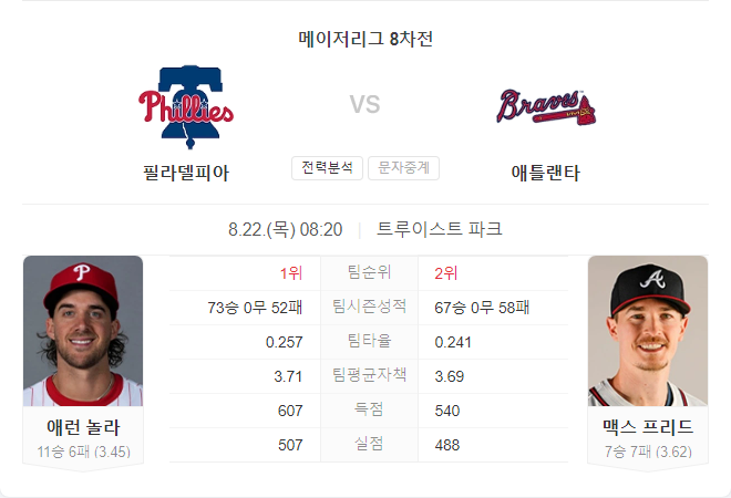 이번 경기는 양 팀 선발 투수의 상태가 중요한 변수로 작용할 것으로 보입니다. 필라델피아의 애런 놀라가 최근 안정적인 투구를 이어가고 있는 반면, 애틀랜타의 맥스 프리드는 부진을 떨치지 못하고 있습니다. 필라델피아는 좌완 투수 공략에 강점을 보이는 팀으로, 현재의 투구 상태와 팀 전력을 고려할 때 필라델피아 필리스가 승리에 더 가까운 상황으로 보입니다.
