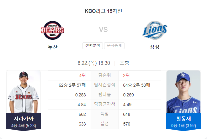 삼성 라이온즈는 최근 연승에 실패하며 타선의 부진이 도드라지고 있습니다. 황동재는 NC를 상대로 5이닝 2실점의 안정적인 투구를 선보였지만, 두산전 첫 등판인 만큼 결과를 지켜봐야 할 것입니다. 이재현의 홈런을 제외하고는 득점 기회가 부족했으며, 타선의 집중력 문제가 포항 시리즈에서 더욱 부각되고 있습니다. 불펜은 4이닝 동안 1실점을 기록했지만, 김태훈의 컨디션은 여전히 불안정한 상태로 보입니다.