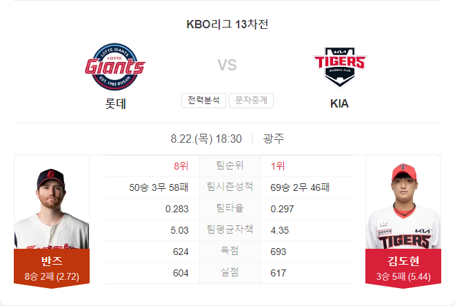8월 22일 KBO 크보 롯데 자이언츠 VS 기아 타이거즈 타카짱 경기 예측 분석