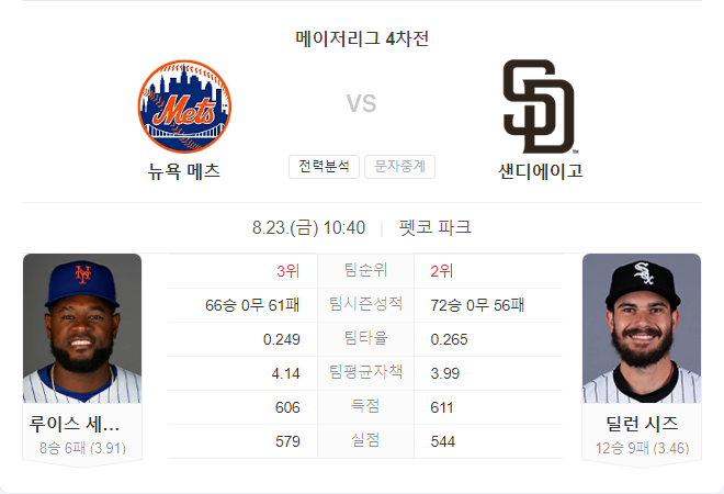 딜란 시즈와 루이스 세베리노는 모두 호투할 가능성이 있는 투수들이지만, 시즈는 홈 경기에서 더 우위를 가질 것으로 보입니다. 또한, 불펜 전투에서도 샌디에이고 파드리스가 유리한 상황입니다. 이러한 요소들을 종합해볼 때, 투수력에서 우세한 샌디에이고 파드리스가 승리에 더 가까워 보입니다.