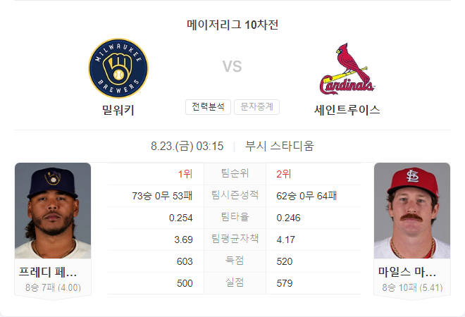 8월 23일 메이저리그 MLB 세인트루이스 카디널스 VS 밀워키 브루어스 타카짱 경기 예측 분석