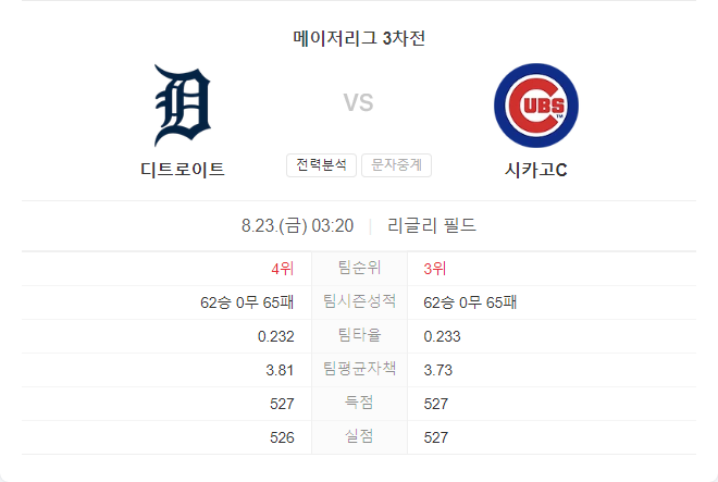 8월 23일 메이저리그 MLB 시카고 컵스 VS 디트로이트 타이거즈 타카짱 경기 예측 분석