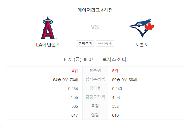 8월 23일 메이저리그 MLB 토론토 블루제이스 VS LA 에인절스 타카짱 경기 예측 분석