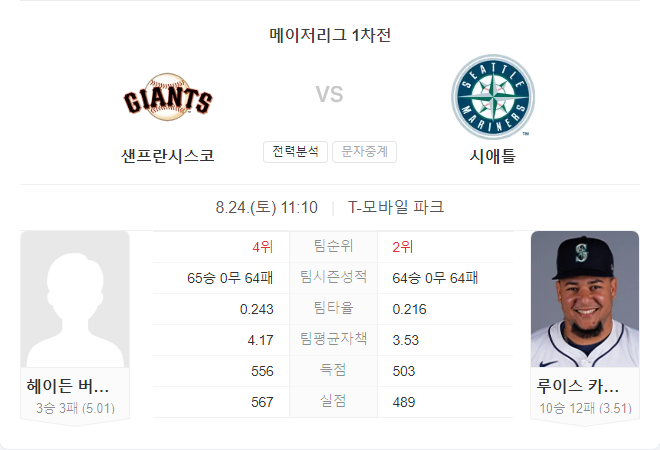 8월 24일 메이저리그 MLB 샌프란시스코 자이언츠 VS 시애틀 매리너스 타카짱 경기 예측 분석