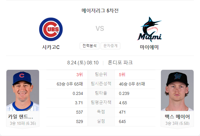 양 팀 모두 타선의 힘은 강하지만, 투수진의 불안정함이 변수로 작용할 수 있습니다. 그러나 마이애미의 불펜이 흔들리는 반면, 시카고 컵스는 불펜의 안정감을 되찾고 있어 승부에서 유리한 위치에 있습니다. 전력에서 앞선 시카고 컵스가 이번 경기에서 승리에 더 가까워 보입니다.