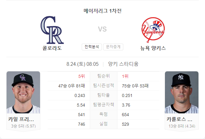 | 8월 23일 메이저리그 MLB 볼티모어 오리올스 VS 휴스턴 애스트로스 타카짱 경기 예측 분석 (0) | 2024.08.22 |