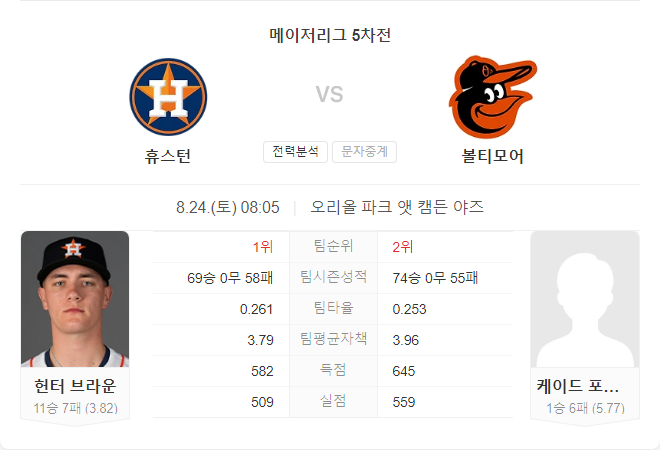 8월 24일 메이저리그 MLB 휴스턴 애스트로스 VS 볼티모어 오리올스 타카짱 경기 예측 분석