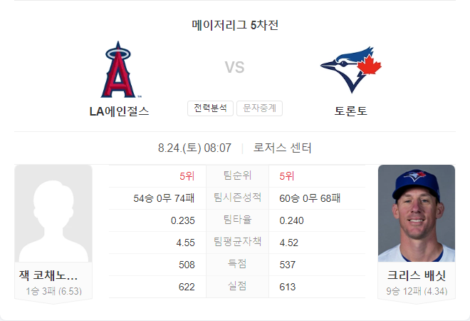 코차노비츠가 토론토 타선을 완전히 봉쇄하기는 어려울 것으로 보이지만, 배싯의 최근 불안정한 투구를 고려할 때 에인절스가 우위를 점할 가능성이 있습니다. 특히, 불펜의 안정성이 더 뛰어난 LA 에인절스가 이번 경기에서 승리할 가능성이 높아 보입니다.