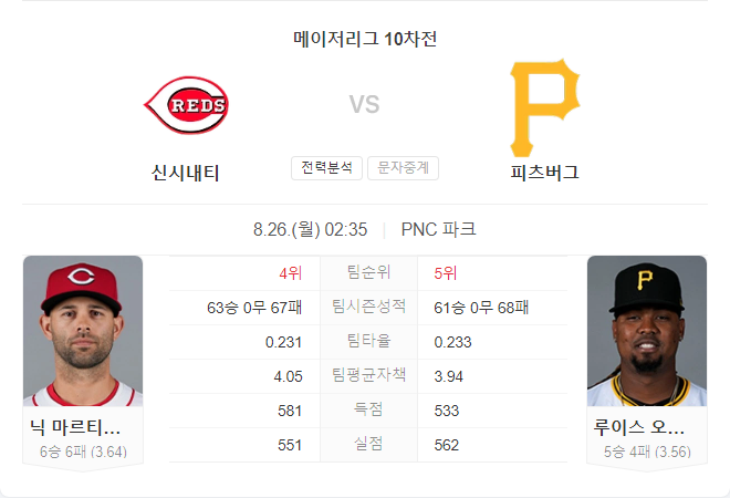 | 8월 26일 메이저리그 MLB 애리조나 다이아몬드백스 VS 보스턴 레드삭스 타카짱 경기 예측 분석 (0) | 2024.08.25 |