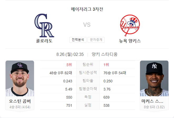 콜로라도 로키스는 이번 시즌 원정 경기에서 심각한 부진을 겪고 있습니다. 최근 9번의 원정 경기에서 8패를 기록하며, 특히 타선에서 큰 어려움을 겪고 있습니다. 원정 경기에서 팀은 평균 3.54점을 기록하며, 이는 리그 최하위권에 해당하는 기록입니다. 오스틴 감버는 최근 좋은 성적을 거두었지만, 이번 시즌 전체적으로는 4.64의 ERA를 기록 중입니다. 특히 원정에서의 성적이 저조한 로키스는 뉴욕 양키스와의 이번 경기에서도 어려움을 겪을 가능성이 큽니다.