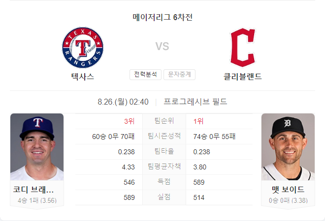 텍사스 레인저스가 클리블랜드 가디언스보다 우위를 점할 가능성이 큽니다. 텍사스는 최근 상승세를 타고 있으며, 브래드포드의 안정적인 투구와 코리 시거의 타격이 큰 역할을 할 것으로 보입니다. 클리블랜드의 타선은 부진에 빠져 있으며, 보이드의 투구 역시 신뢰하기 어려운 상황입니다.
