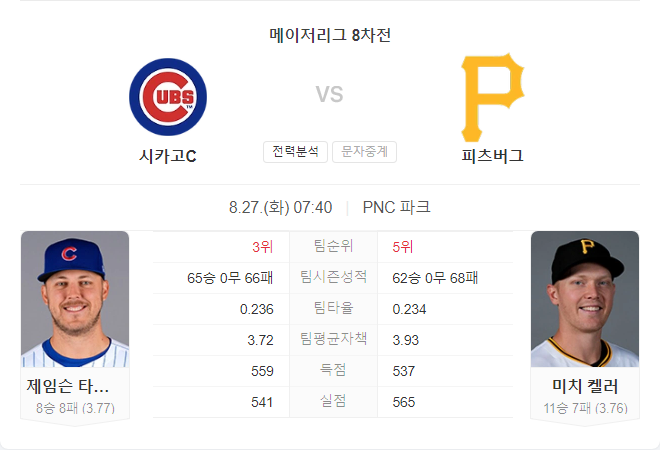 | 8월 27일 메이저리그 MLB 캔자스시티 로열스 VS 클리블랜드 가디언스 2차전 타카짱 경기 예측 분석 (0) | 2024.08.26 |