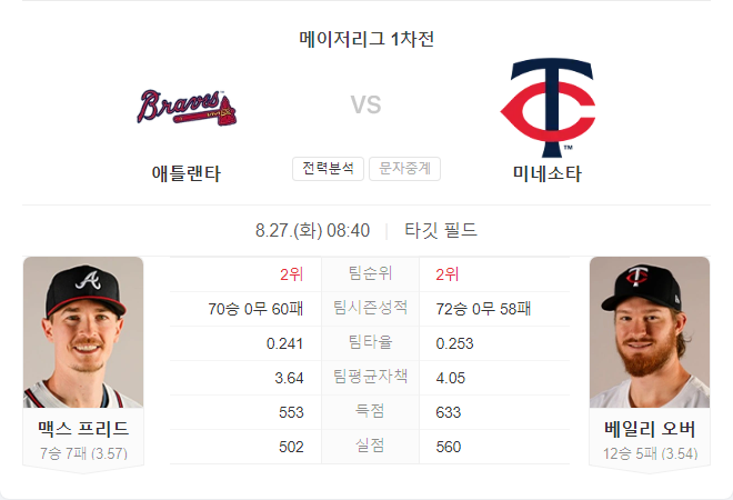 | 8월 27일 메이저리그 MLB 뉴욕 양키스 VS 워싱턴 내셔널스 타카짱 경기 예측 분석 (0) | 2024.08.26 |