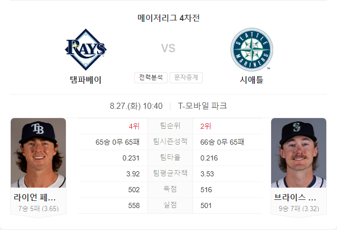 시애틀은 브라이스 밀러를 선발 투수로 내세울 예정입니다. 밀러는 이번 시즌 25경기에서 9승 7패를 기록하며 3.32의 평균자책점을 유지하고 있습니다. 최근 경기에서 꾸준한 투구를 이어가고 있는 밀러는 탬파베이를 상대로 안정적인 피칭을 기대할 수 있습니다.