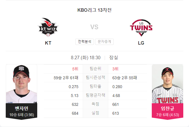 8월 27일 KBO 프로야구 KT 위즈 VS LG 트윈스 타카짱 경기 예측 분석