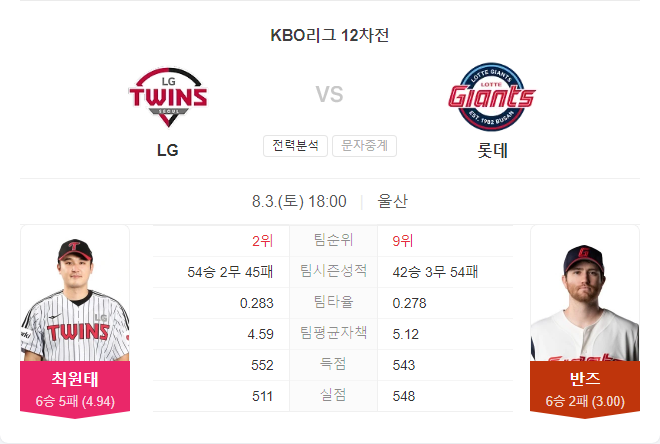 8월 3일 KBO 프로야구 LG 트윈스 VS 롯데 자이언츠 타카짱의 경기 예측 분석