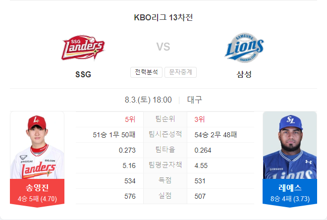 SSG 랜더스는 최근 삼성을 상대로 시즌 7승 5패로 우위를 점하고 있다. 하지만 최근 2연패에 빠지며 5위로 내려앉았다. SSG의 선발 송영진은 이번 시즌 18경기에서 4승 5패, 평균자책점 4.70을 기록하고 있으며, 삼성과의 맞대결에서는 평균자책점 1.64를 기록하며 안정적인 피칭을 보여주고 있다. SSG는 선발 투수의 호투에도 불구하고 막판에 무너지는 경향이 있어, 불펜의 안정감이 중요하다.