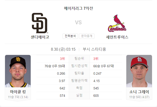 8월 30일 메이저리그 MLB 샌디에이고 파드리스 VS 세인트루이스 카디널스 타카짱 경기 예측 분석