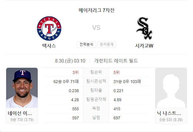텍사스 레인저스는 이번 시즌 전반적으로 부진한 성적을 기록하고 있지만, 이번 경기에서는 강력한 모습을 보일 가능성이 큽니다. 네이선 이볼디는 시즌 10승을 노리고 있으며, 비록 원정에서 부진한 경향이 있지만, 이번 상대인 시카고 화이트삭스를 고려할 때 QS(퀄리티 스타트) 이상의 투구를 기대할 수 있습니다. 텍사스의 타선은 최근 다소 부진하지만, 불펜은 안정적인 모습을 보이고 있어 경기 후반부에도 우세를 유지할 것으로 보입니다.