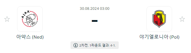 야기엘로니아는 폴란드의 클럽으로, 1차전에서 아약스에게 1대4로 패배하며 어려운 상황에 처해 있습니다. 이번 경기에서도 수비적인 전략에 집중할 것으로 보이며, 아약스의 강력한 공격을 억제하기 위해 수비 조직을 강화할 것입니다. 그러나 아약스의 공격력을 막기에는 어려움이 있을 것으로 보이며, 반전을 이루기는 쉽지 않을 것입니다.