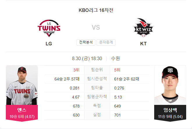 8월 27일 KBO 프로야구 KT 위즈 VS LG 트윈스 타카짱 경기 예측 분석 (0) | 2024.08.27 |