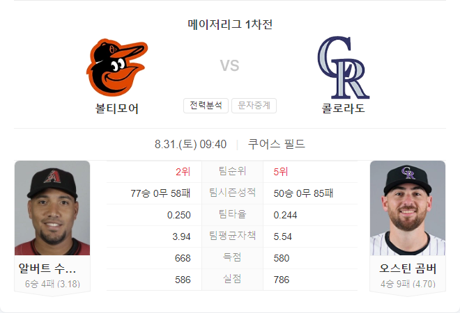 8월 31일 메이저리그 MLB 볼티모어 오리올스 VS 콜로라도 로키스 타카짱 경기 예측 분석