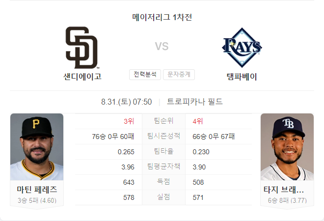 샌디에이고 파드리스는 마틴 페레즈의 안정적인 투구와 더불어 팀의 불펜이 더 나은 상태를 유지하고 있어 이번 경기에서 우위를 점할 가능성이 큽니다. 반면 탬파베이 레이스는 브래들리의 부진과 타선의 침체로 인해 어려움을 겪을 것으로 보입니다.
