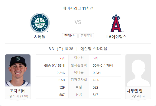 8월 31일 메이저리그 MLB 시애틀 매리너스 VS LA 에인절스 타카짱 경기 예측 분석