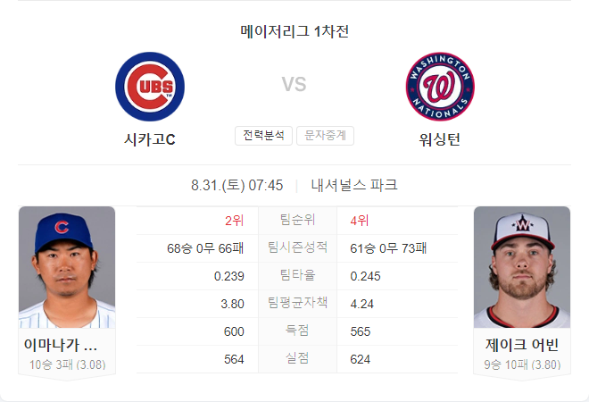 8월 31일 메이저리그 MLB 시카고 컵스 VS 워싱턴 내셔널스 타카짱 경기 예측 분석