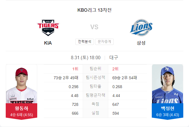 두 팀 모두 최근 경기력에서 기복을 보이고 있지만, 삼성의 최근 상승세와 선발 투수 백정현의 안정성은 긍정적인 요소로 작용할 것입니다. KIA는 홈에서의 타격은 좋지만, 불펜 문제와 상위팀 상대에서의 기복이 경기 결과에 영향을 미칠 가능성이 큽니다. 두 팀의 경기력 차이는 미세하며, 삼성의 승리 가능성이 높아 보입니다.