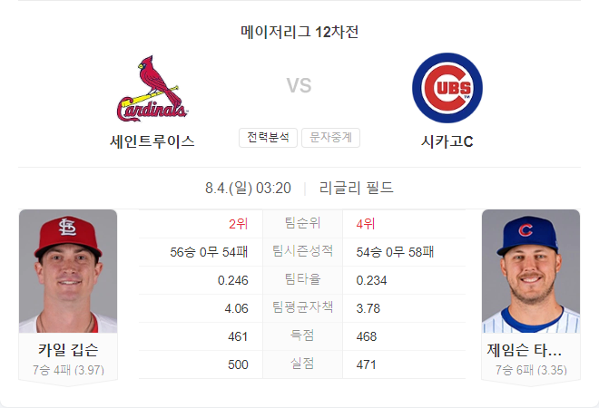 | 8월 2일 MLB 세인트루이스 카디널스 VS 시카고 컵스 타카짱의 경기 예측 분석 (0) | 2024.08.01 |