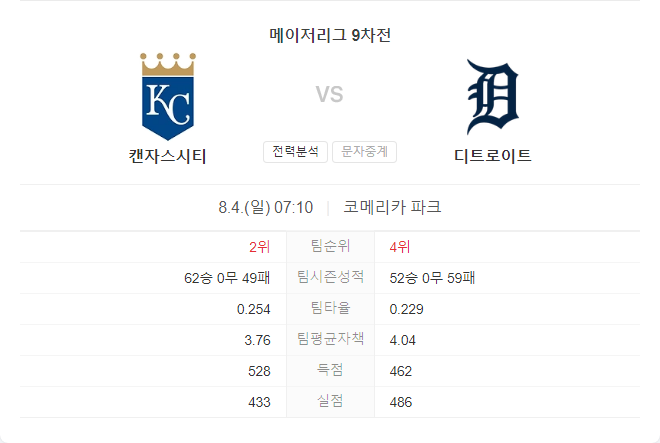 캔자스시티 로열스는 최근 좋은 성적을 유지하며 상승세를 타고 있습니다. 반면, 디트로이트 타이거즈는 최근 부진한 성적을 기록하고 있습니다. 로열스의 선발 투수 마이클 로렌젠은 안정적인 투구를 보여주고 있으며, 타이거즈는 불펜 게임으로 인해 불안정한 경기를 펼칠 가능성이 큽니다. 따라서 이번 경기는 캔자스시티 로열스가 승리할 가능성이 높습니다.