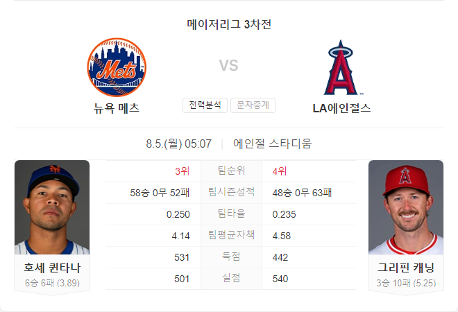 이번 경기는 뉴욕 메츠가 유리할 것으로 보입니다. 메츠의 타선은 마크 비엔토스, J.D. 마르티네즈, 피트 알론소 등 강력한 타자들이 있어 에인절스의 그리핀 캐닝을 상대로 많은 득점을 올릴 수 있을 것입니다. 반면, 에인절스의 타선은 퀸타나를 상대로 득점을 올리는 데 어려움을 겪을 가능성이 큽니다. 따라서 이번 경기는 메츠가 승리할 가능성이 높습니다.