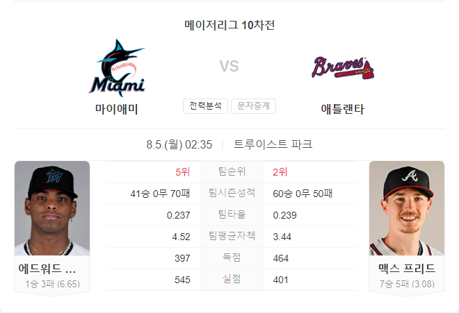 마이애미 말린스와 애틀랜타 브레이브스의 경기는 브레이브스가 우세할 것으로 예상됩니다. 말린스는 타격과 투수에서 모두 어려움을 겪고 있으며, 에드워드 카브레라의 투구가 불안정합니다. 반면, 브레이브스는 강력한 타격력과 안정적인 투수진을 바탕으로 경기를 주도할 가능성이 큽니다. 맥스 프리드의 복귀도 브레이브스에게 큰 힘이 될 것입니다.