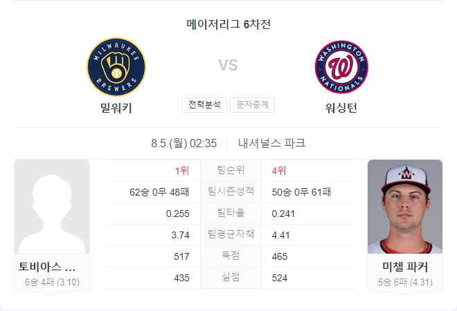 밀워키 브루어스와 워싱턴 내셔널스의 경기는 양 팀 모두 최근 부진을 극복하려는 의지가 강한 상황입니다. 밀워키는 최근 두 시리즈에서 패배했지만, 토비아스 마이어스가 안정적인 투구를 보여주고 있습니다. 반면, 워싱턴은 최근 승리를 거두었지만, 미첼 파커의 투구가 다소 불안정한 모습을 보이고 있습니다. 밀워키의 타선이 강력하게 작용할 가능성이 크며, 이 경기는 밀워키가 승리할 가능성이 높습니다.