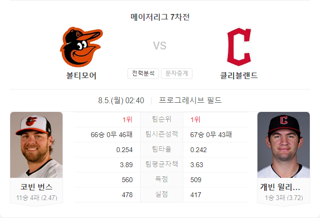 이번 경기는 볼티모어 오리올스의 승리가 예상됩니다. 에이스 코빈 번스가 선발로 나서며, 최근 좋은 투구를 이어가고 있습니다. 볼티모어의 강력한 타선도 가빈 윌리엄스를 상대로 충분히 득점을 올릴 수 있을 것으로 보입니다. 클리블랜드의 불펜이 강력하지만, 번스와 볼티모어의 타선이 조화를 이루어 승리를 가져올 가능성이 높습니다.